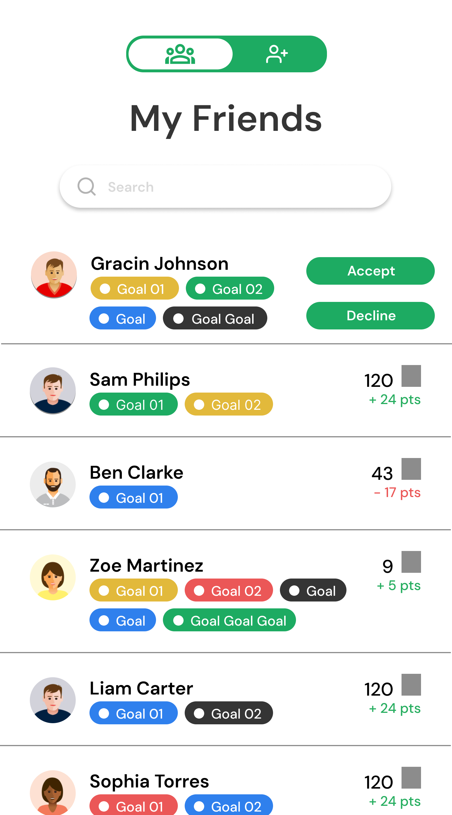 The Friends view allows users to track their progress alongside friends and discover potential new connections based on shared goals. By showcasing each friend’s habits, achievements, and ongoing challenges, this screen promotes mutual encouragement and friendly competition. The ability to view others’ goals creates a supportive community where progress is both personal and social.