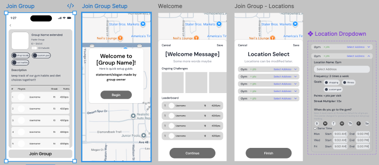 With the app’s structure and user flow defined, I developed low-fidelity wireframes to visualize the core layout and interactions. These early designs focused on clarity, motivation, and usability—organizing key features such as goal tracking, friend activity, and progress updates in an intuitive way. Working in low fidelity allowed me to experiment with different ways to balance social engagement and personal progress without distraction. This stage made it easier to gather feedback, refine navigation, and ensure that every screen supported the app’s goal of helping users build consistent, achievable habits before moving on to higher-fidelity designs.